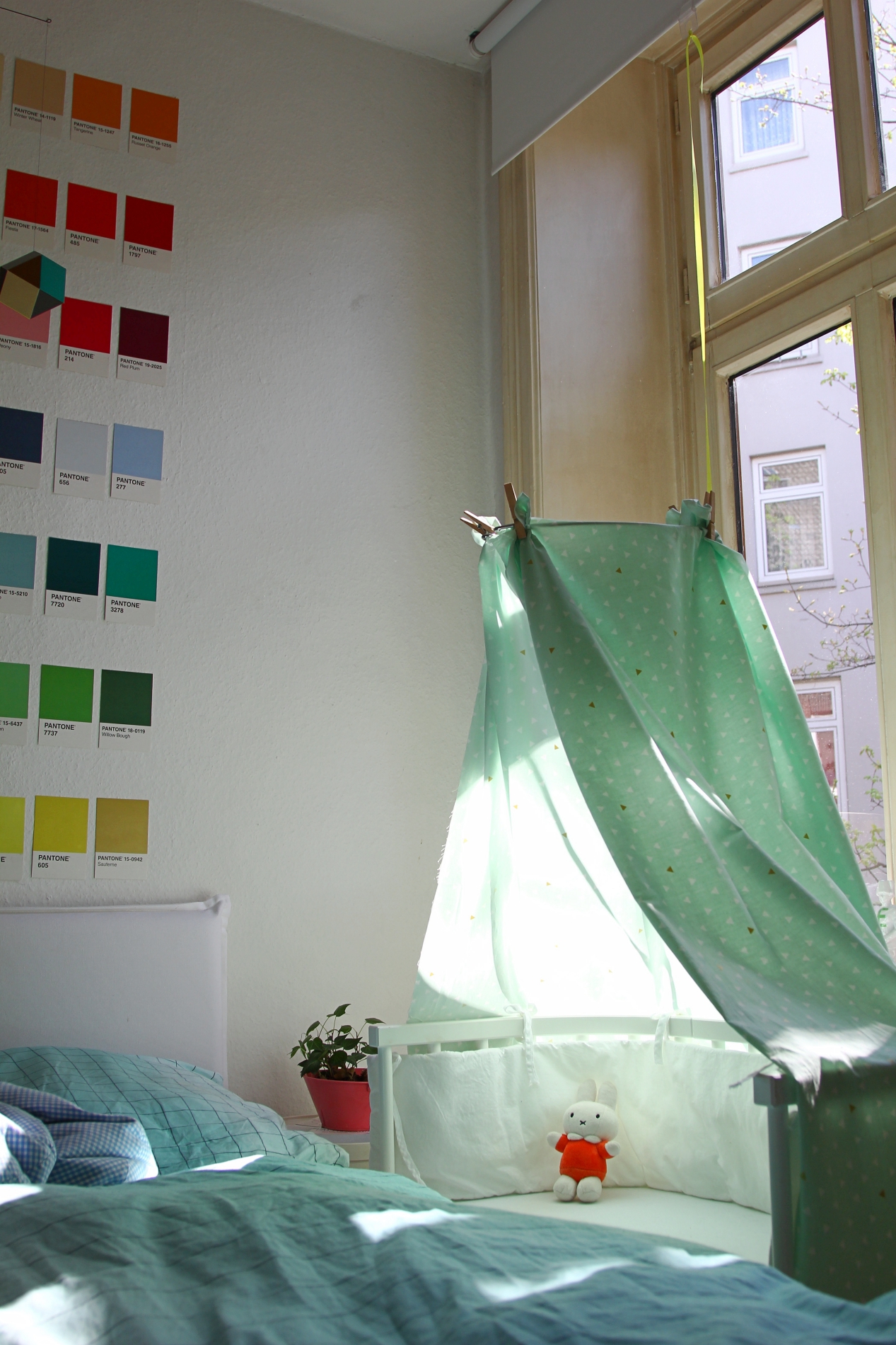 Die Preisempfehlung für ein neues Bettchen liegt bei ca.€175,-. Meist bekommt man es aber günstiger. Zum Beispiel hier. Wir haben unseres über eBay Kleinanzeigen ge- und auch wieder verkauft. Dort werden immer wieder gut erhaltene Modelle mit diversen Extras angeboten. Auf eine teure neue Matratze haben wir verzichtet, sondern dicken Kaltschaum bei Schaumstoff Lübke für ca. €10,- zuschneiden lassen. Den Stoff für den Himmel habe ich bei Frau Tulpe gekauft. Ich habe ihn einfach mit Wäscheklammern am Gestell befestigt, da ich nie dazu gekommen bin, ihn zu vernähen.