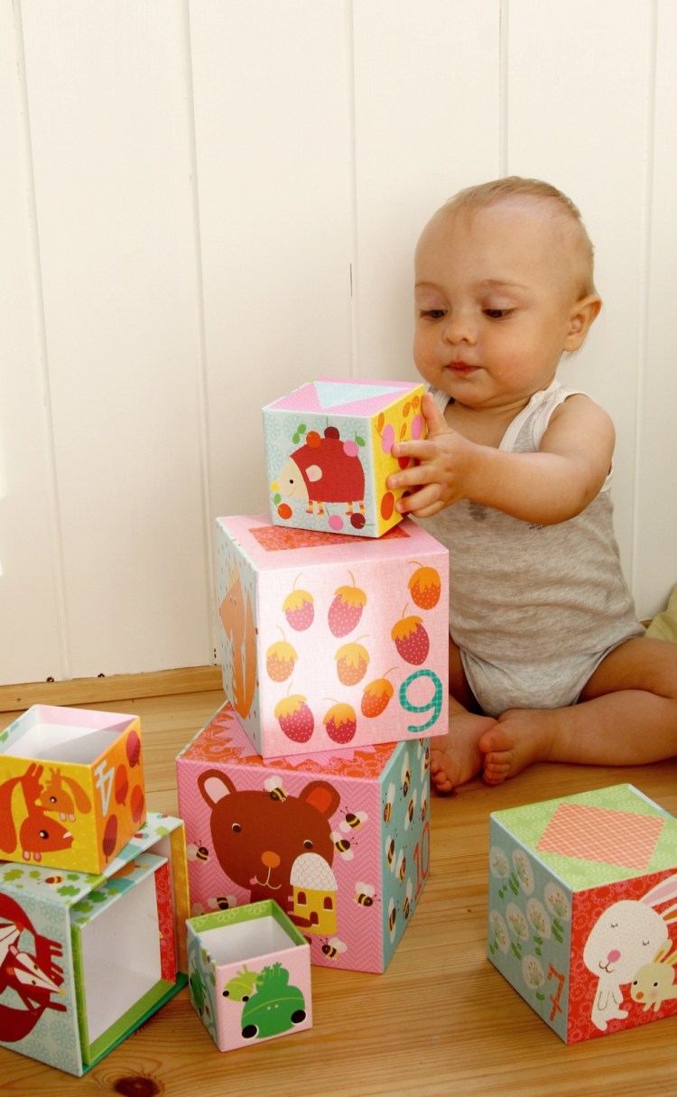 Diesen Stapelturm von Djeco kauften wir als Noam etwa sechs Monate alt war. Er besteht aus zehn liebevoll illustrierten Pappboxen, mit denen Kinder nicht nur Türme bauen können, sondern noch verschiedene Tiere und Formen, sowie die Zahlen von eins bis zehn kennenlernen. Anfangs warf Noam die Türme, die wir ihm unermüdlich bauten, immer wieder um. Bald fand er aber heraus, dass man die kleinen Würfel in die großen stecken kann und dass sogar kleine Kuscheltiere, Rasseln und Schnuller hineinpassen. Vor ein paar Tagen hat er nun das erste mal einen kleinen Turm gebaut. Wir sind begeistert. Von Noam, aber auch von diesem schönen Spielset.
