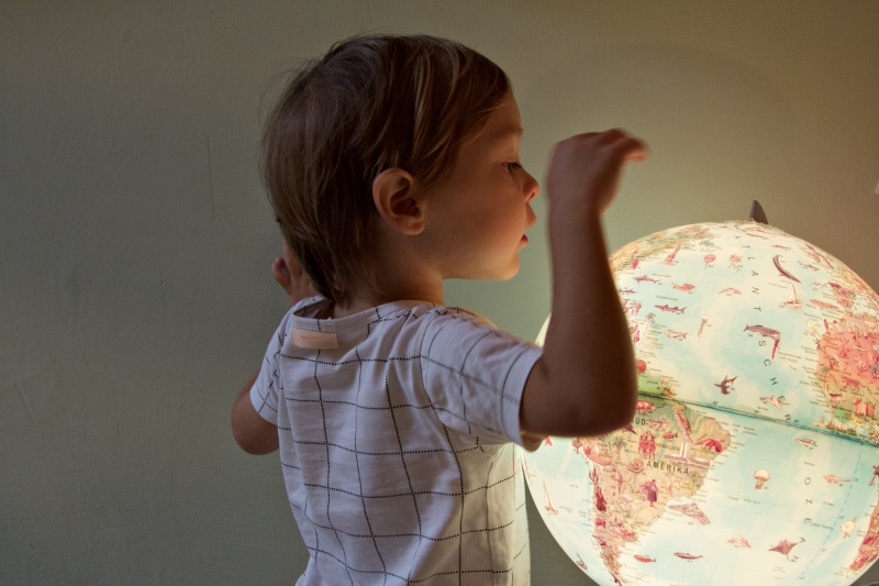 Als wir im Sommer bei Noams Oma waren, haben wir im Keller diesen alten Globus entdeckt. Er ist von Ravensburger und hat einmal Daniels Schwestern gehört. Ein paar Jahre hat er schon auf dem Buckel, aber er ist top in Schuss und funktioniert, also leuchtet, einwandfrei. Für mich nicht nur ein toller Blickfang im Kinderzimmer, sondern auch ein schönes Nachtlicht.