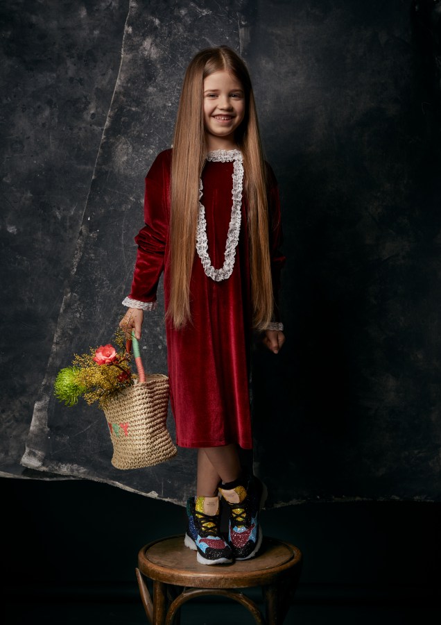 10. Jolante trägt ein Samtkleid von Fish&Kids über Little Wow. Die stylishen Glitzer-Sneaker ergeben einen tollen Bruch dazu und sind vom hippen Label Maison Mangostan, das ihr ebenfalls bei Little Wow bekommt.