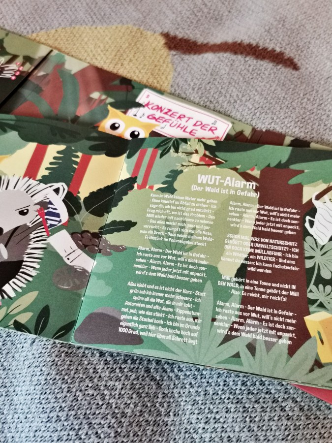 Sie trifft auf die Eichhörncheneltern, die voller Liebe für ihre Babys sind und auf die traurige Wölfin, die ihre Trauer in einem wunderschönen ruhigen Lied zum Ausdruck bringt. Noams Favorit ist derzeit der wütende Igel. Der hat auch alles Recht so richtig auszurasten. Denn der Wald ist in Gefahr. Die Menschen hinterlassen Müll und da kann man wirklich mal so richtig sauer werden.