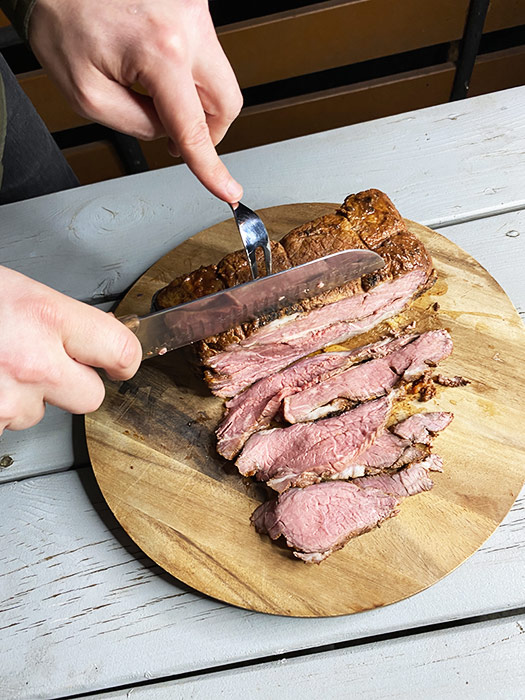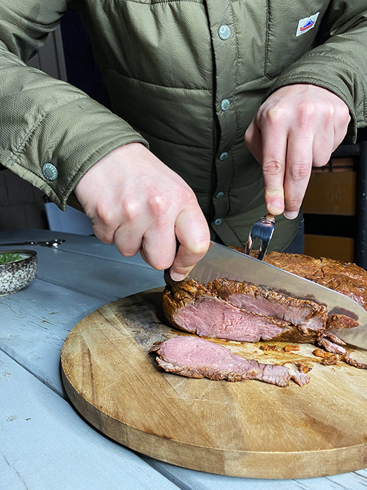 Aber zurück zu unserem Roastbeef: Das leckere Roastbeef aus der Färse in bester Bioqualität stammte aus Brandenburg, bestellt haben wir es ein paar Tage zuvor bei den Fleisch-Rebellen. Die sind wiederum in Berlin zu finden, haben aber auch einen exklusiven Onlineshop, in dem es viel regionales Fleisch und zudem Fisch gibt. Nachdem wir das Beef großzügig mit dem „Traeger Beef Rub“ eingerieben hatten, ging es ab damit in den Smoker. Eine genaue Beschreibung zum Vorheizen und der perfekten Gar-Temperatur findet ihr in der Traeger-App, die euch super durch die einzelnen Schritte führt. Und mit dem digitalen Thermometer und der Option auf ein Warnsignal direkt aufs Smartphone, kann man sich ohne Probleme in der Zwischenzeit anderen Dingen widmen. Für den Kopf echt eine Wohltat, denn es gab genug andere Dinge zu tun.