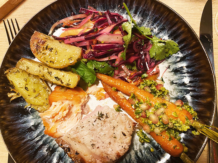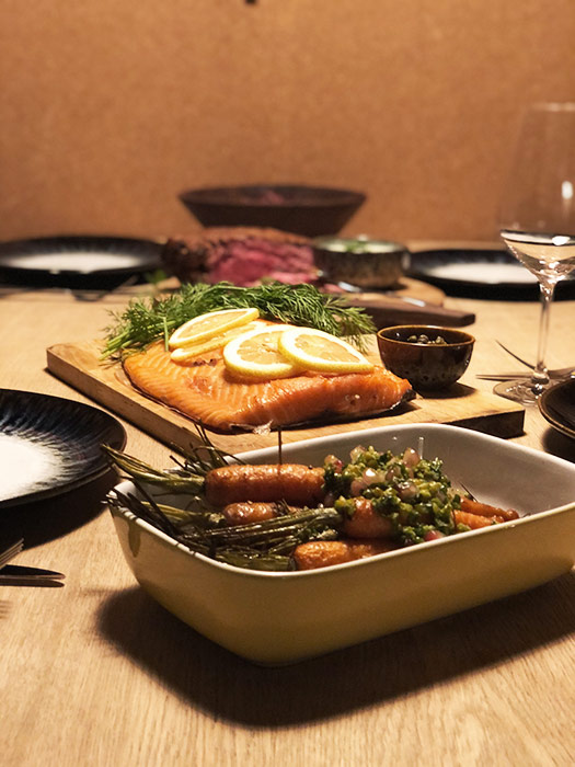 Der Tisch war nun eingedeckt, und nach und nach kamen die Speisen aus allen Ecken herangetragen. Und so platt wir am Ende auch waren, jedes einzelne Gericht sah nicht nur fantastisch aus, sondern hat unsere Erwartungen wirklich übertroffen. Nie hätten wir gedacht, so eine große Anzahl an Gerichten so auf den Punkt zubereiten zu können. Vom Garpunkt des Fleisches bis zur Zartheit des Lachses. Aber auch geschmacklich: das nussige, süss-saure Pistazien-Granatapfel-Relish mit den rauchigen Karotten – echt sehr, sehr gut.