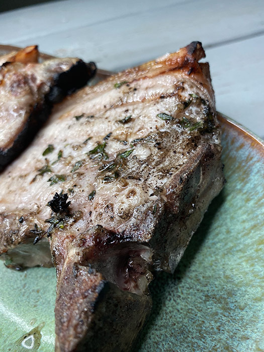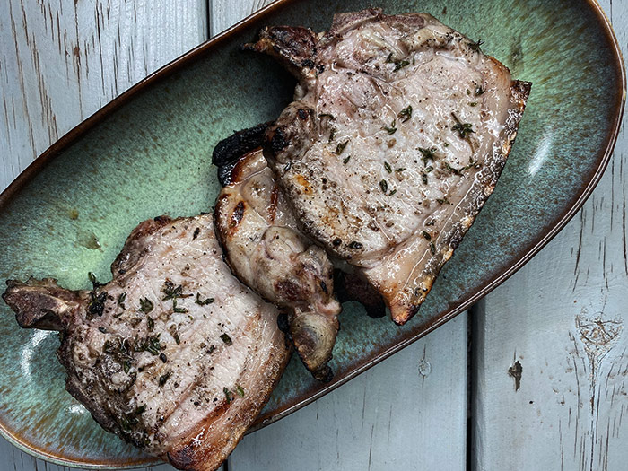 Nun hatten wir nur noch die Schweinekoteletts vom guten Kräuterschwein vor uns. Von denen wussten wir aber, dass die meiste Arbeit mit dem Einlegen getan war. Jetzt mussten wir sie nur mit einer Knoblauch-Thymian-Butter einreiben und dann bei hoher Temperatur ab in unseren „Smoky“. Nach 15 Minuten waren die Dinger fertig. Leider ein bisschen zu durch, aber trotzdem zart und geschmacklich – phänomenal! Eine leichte Süße und Fruchtigkeit. Kannten wir so noch nicht, wollen wir aber ab jetzt immer so haben!