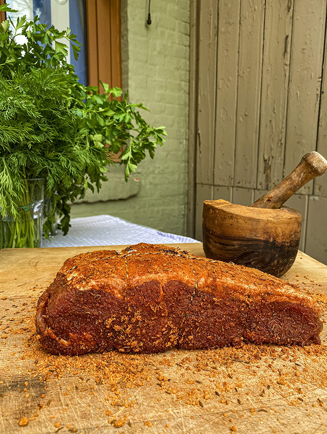 Am nächsten Tag ging es schon vormittags mit Schnippelarbeit und mit den weiteren Vorbereitungen für unser Roastbeef weiter – denn eines hatten wir schon früh erkannt, ein gutes Zeitmanagement ist der Schlüssel für ein erfolgreiches und köstliches Frühlingsessen. Ein Tipp von uns: Lest die Rezepte immer bis zum Schluss durch, denn wenn es als letzten Punkt heisst: „Und nun für 24 Stunden ab damit in den Kühlschrank“ ist es am Tag des großen Festmahls meistens zu spät.